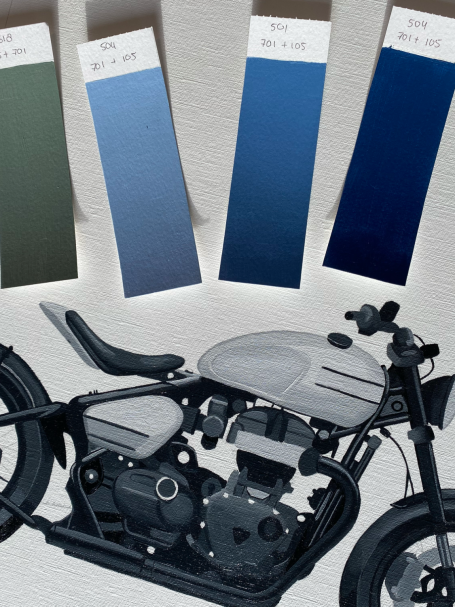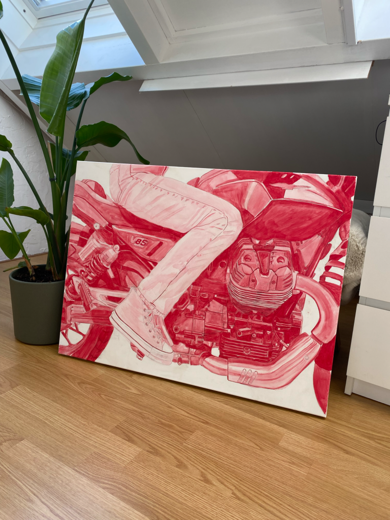 In het atelier werk ik op het moment aan een Moto Guzzi V85 schilderij. Daarnaast ben ik aan het experimenten met het ontwerpen van een poster collectie.