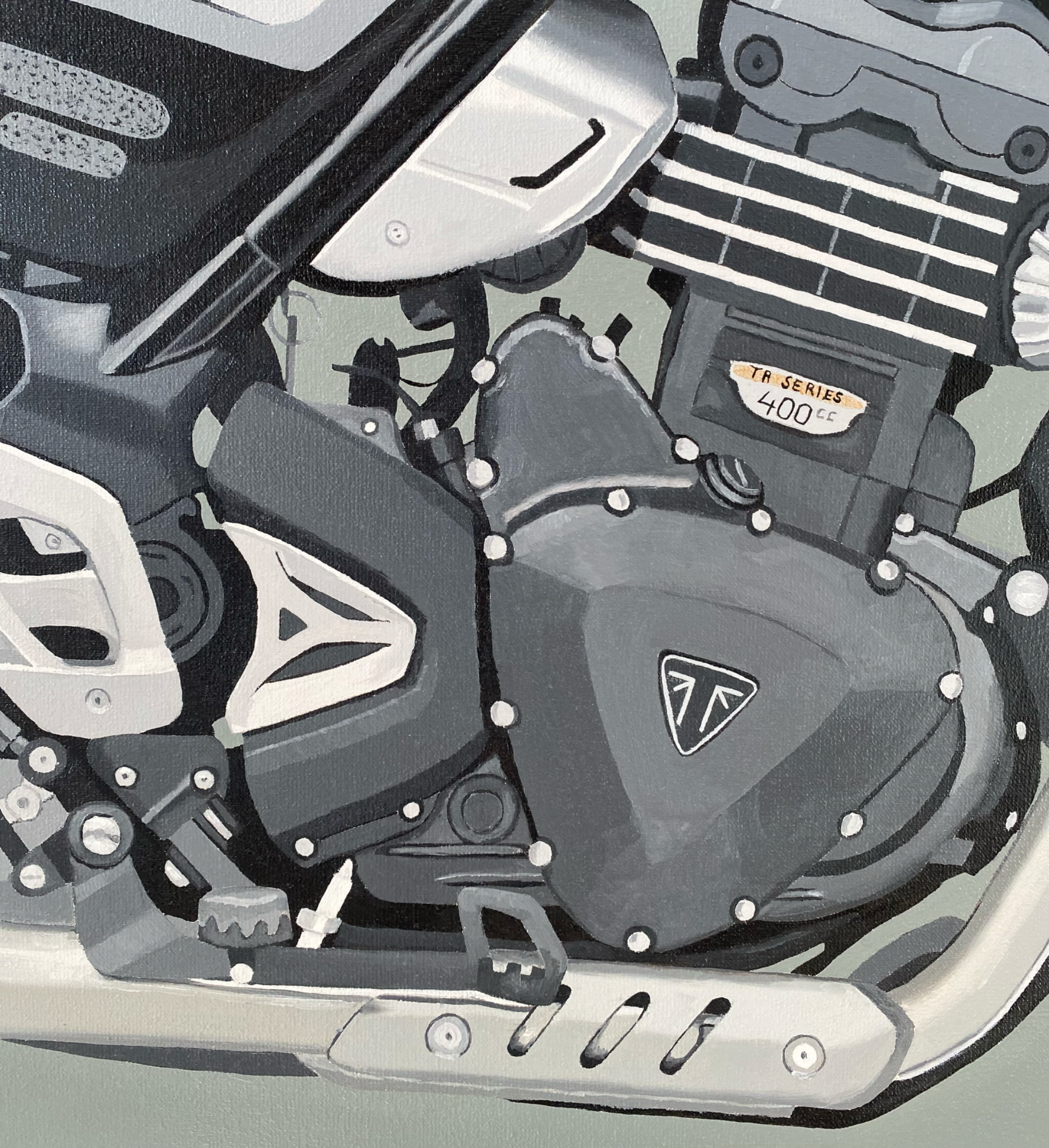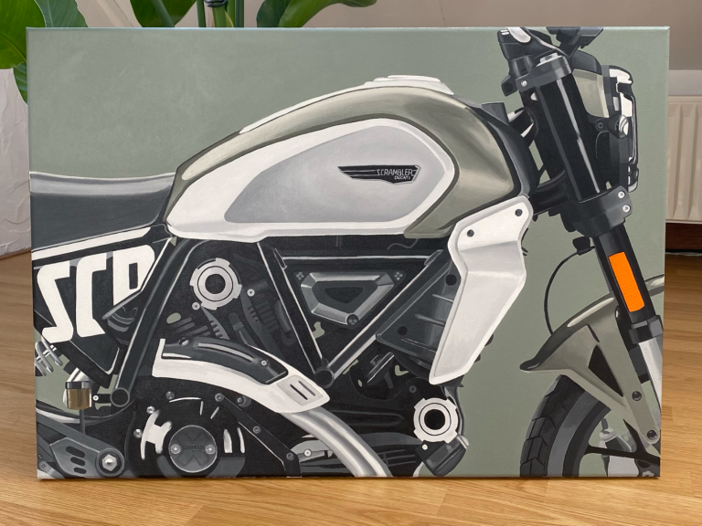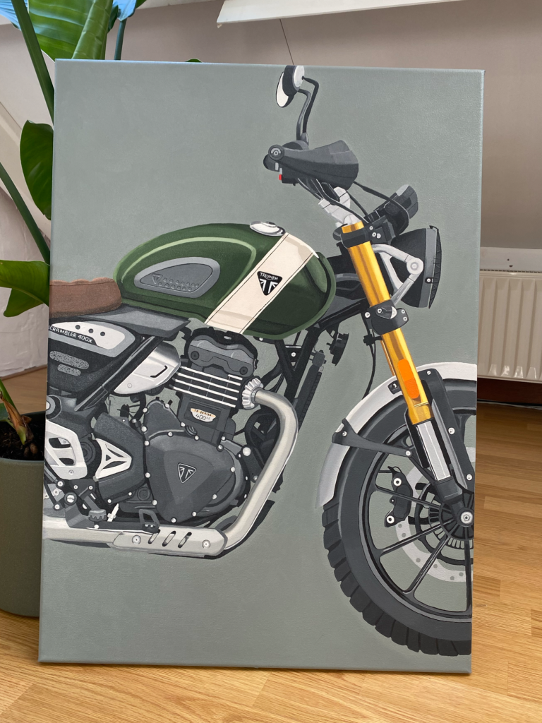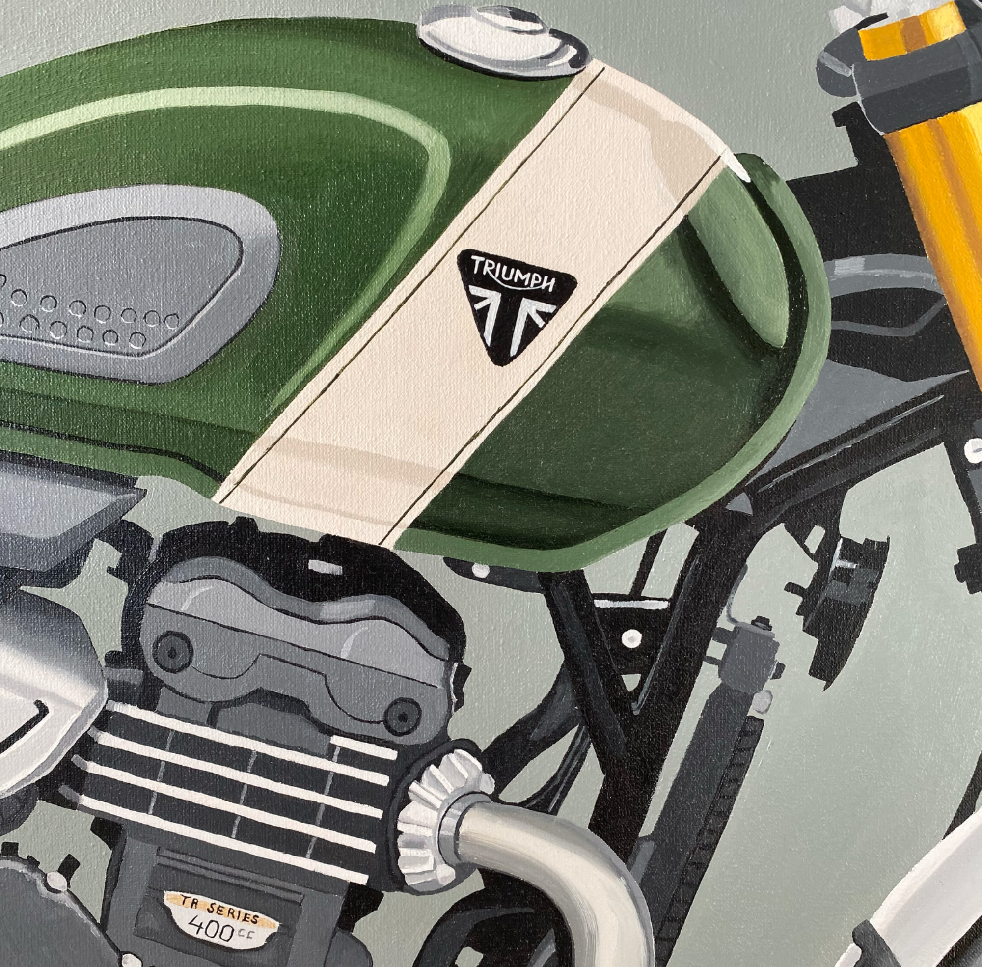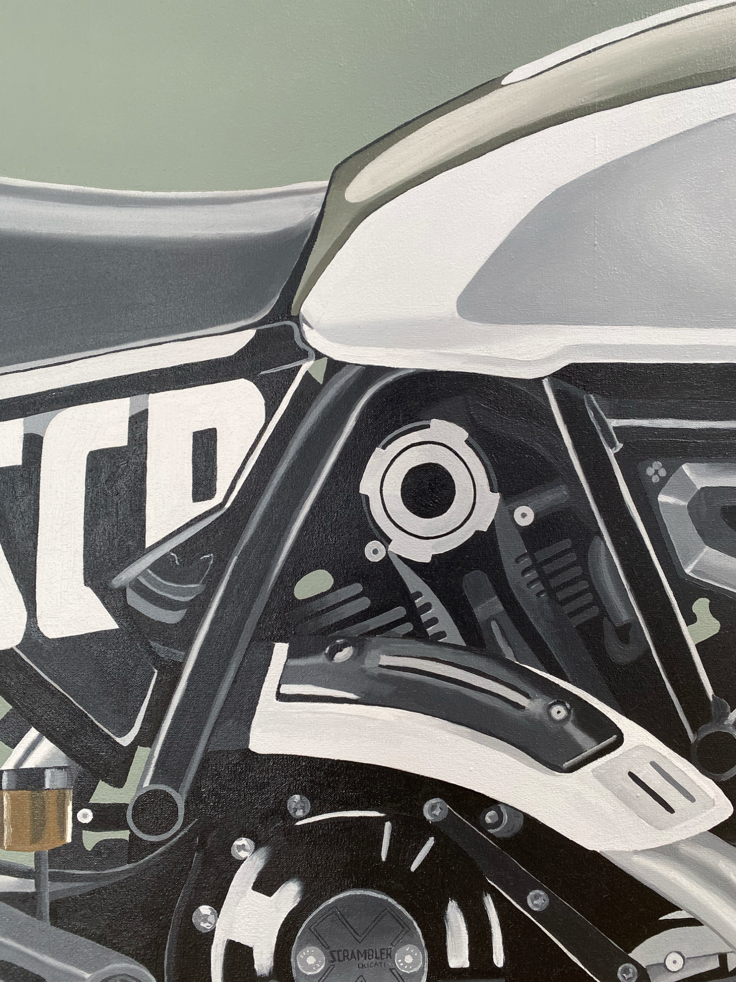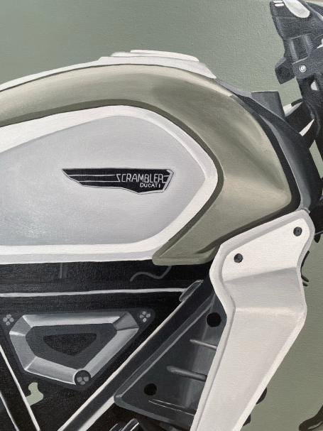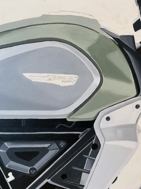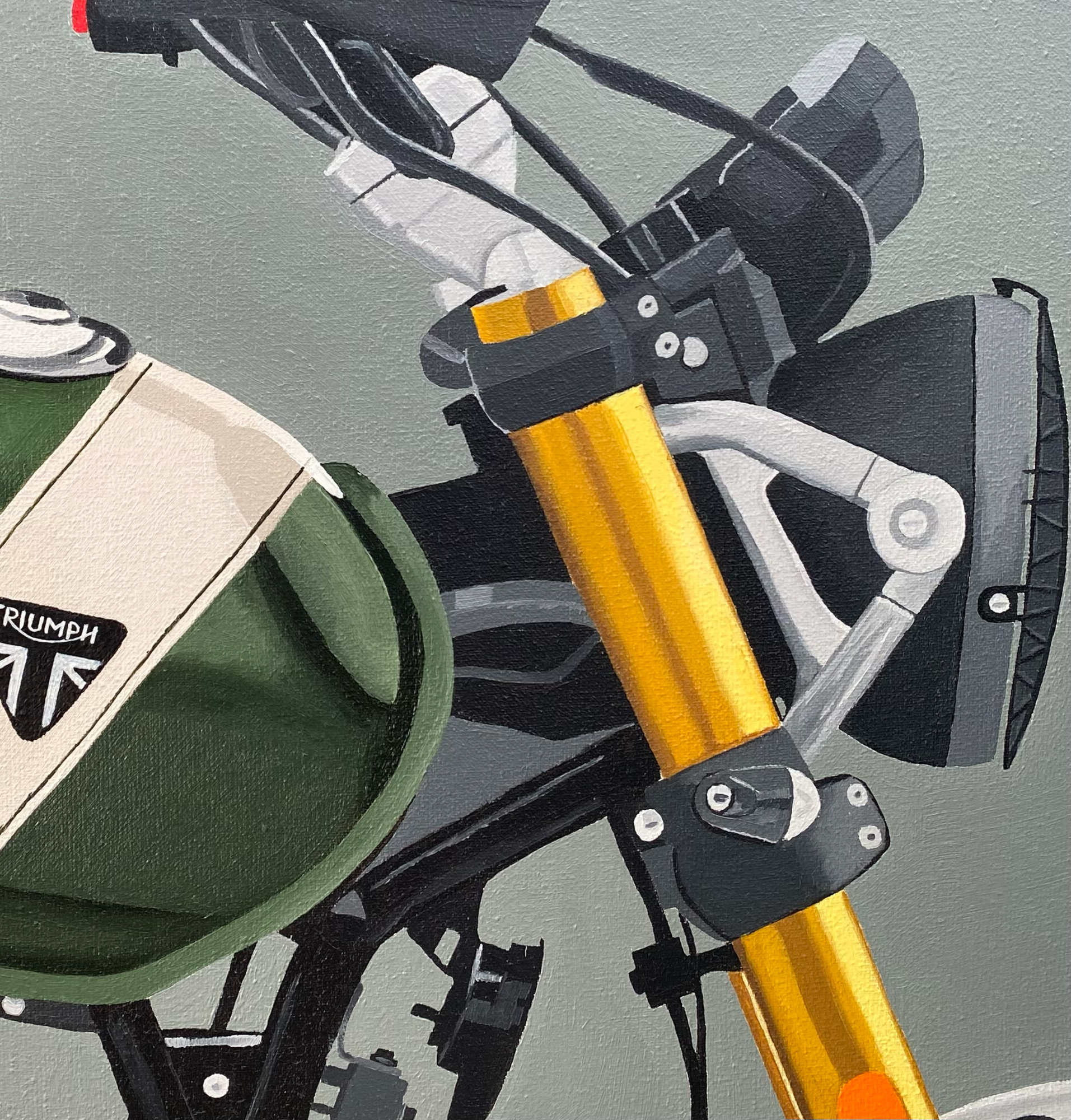 In het atelier werk ik momenteel aan drie schilderijen die samen de Scrambler Collectie vormen. Eén doek staat nog nat op de ezel, terwijl de andere twee volop in het schilderproces zitten. Voor deze serie koos ik drie scramblers van verschillende merken, verbonden door de terugkerende kleur groen.