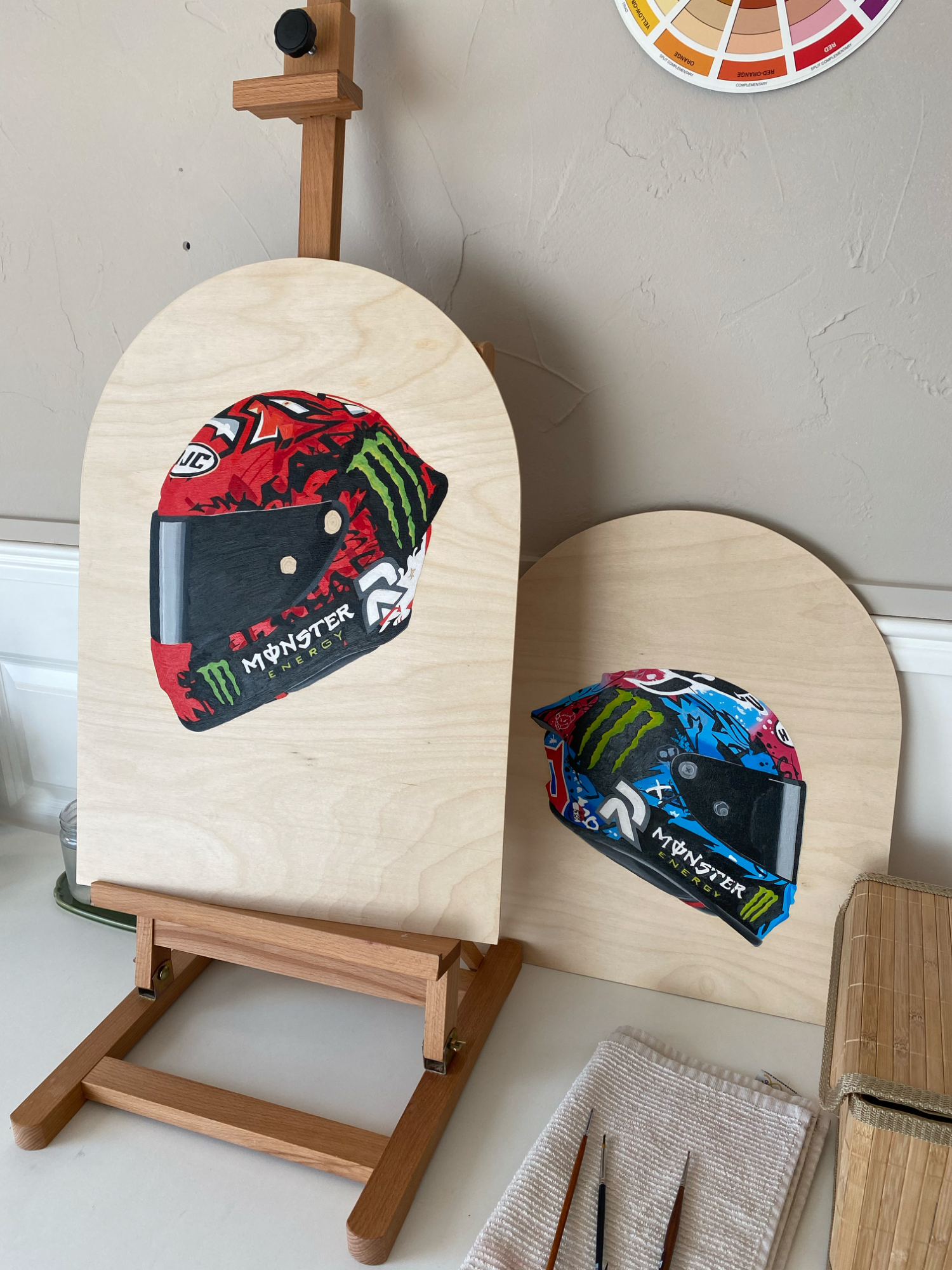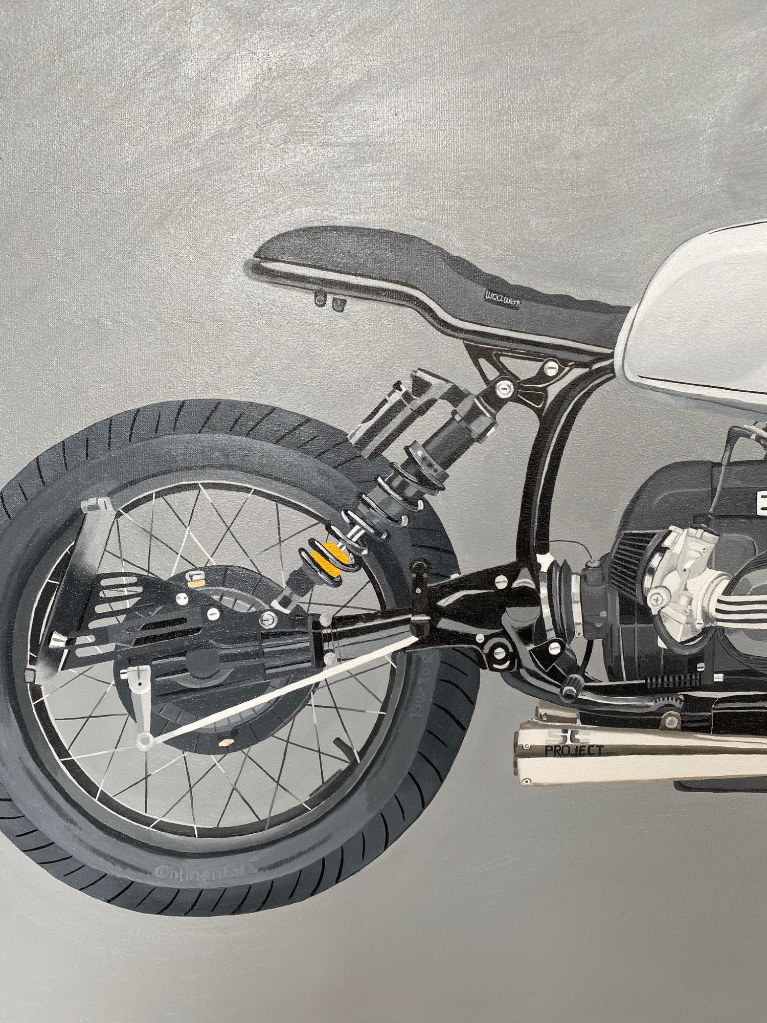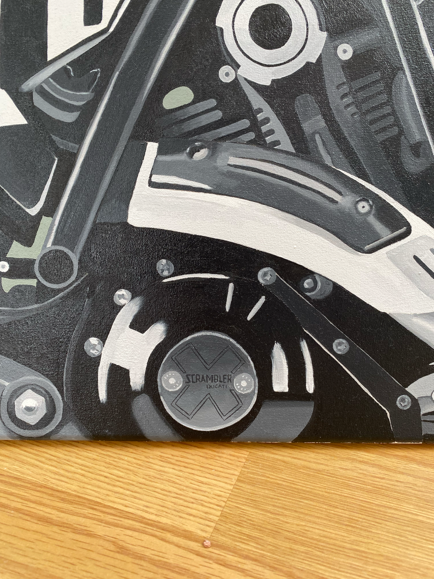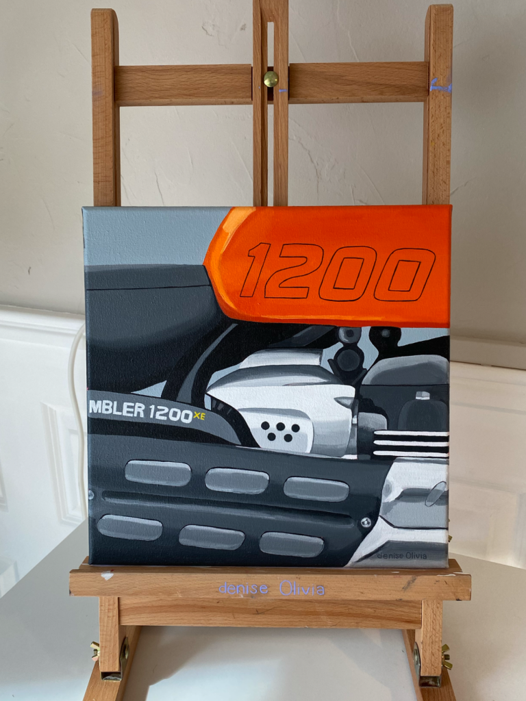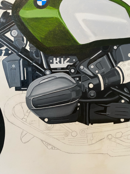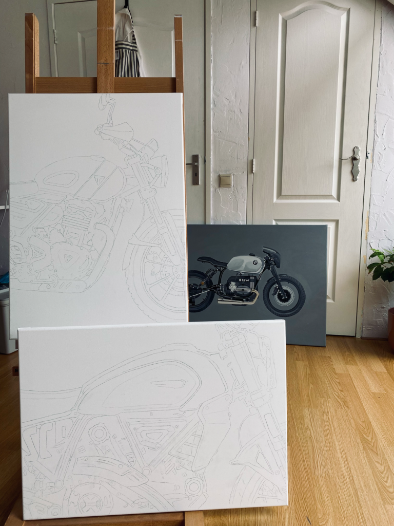 In het atelier werk ik momenteel aan drie schilderijen die samen de Scrambler Collectie vormen. Eén doek staat nog nat op de ezel, terwijl de andere twee volop in het schilderproces zitten. Voor deze serie koos ik drie scramblers van verschillende merken, verbonden door de terugkerende kleur groen.